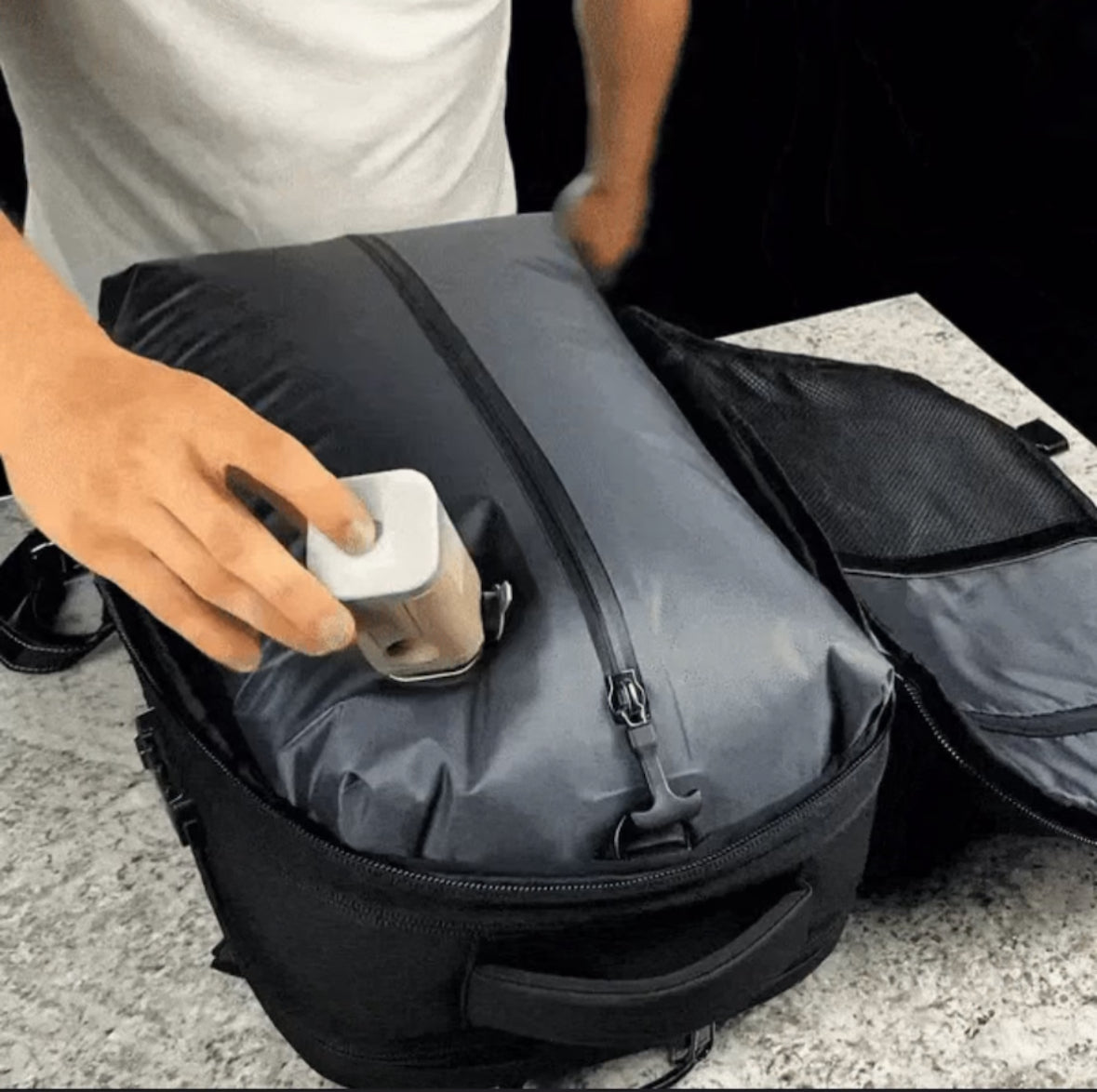 You'll have no trouble taking our backpack on the plane. Our patented vacuum-sealing technology in the backpack fully complies with TSA regulations and airline guidelines. It operates without batteries or electrical components, making it safe for air travel. Plus, its compact and efficient design fits easily in overhead compartments or under the seat, ensuring a hassle-free travel experience. However, it's always advisable to check with airlines.